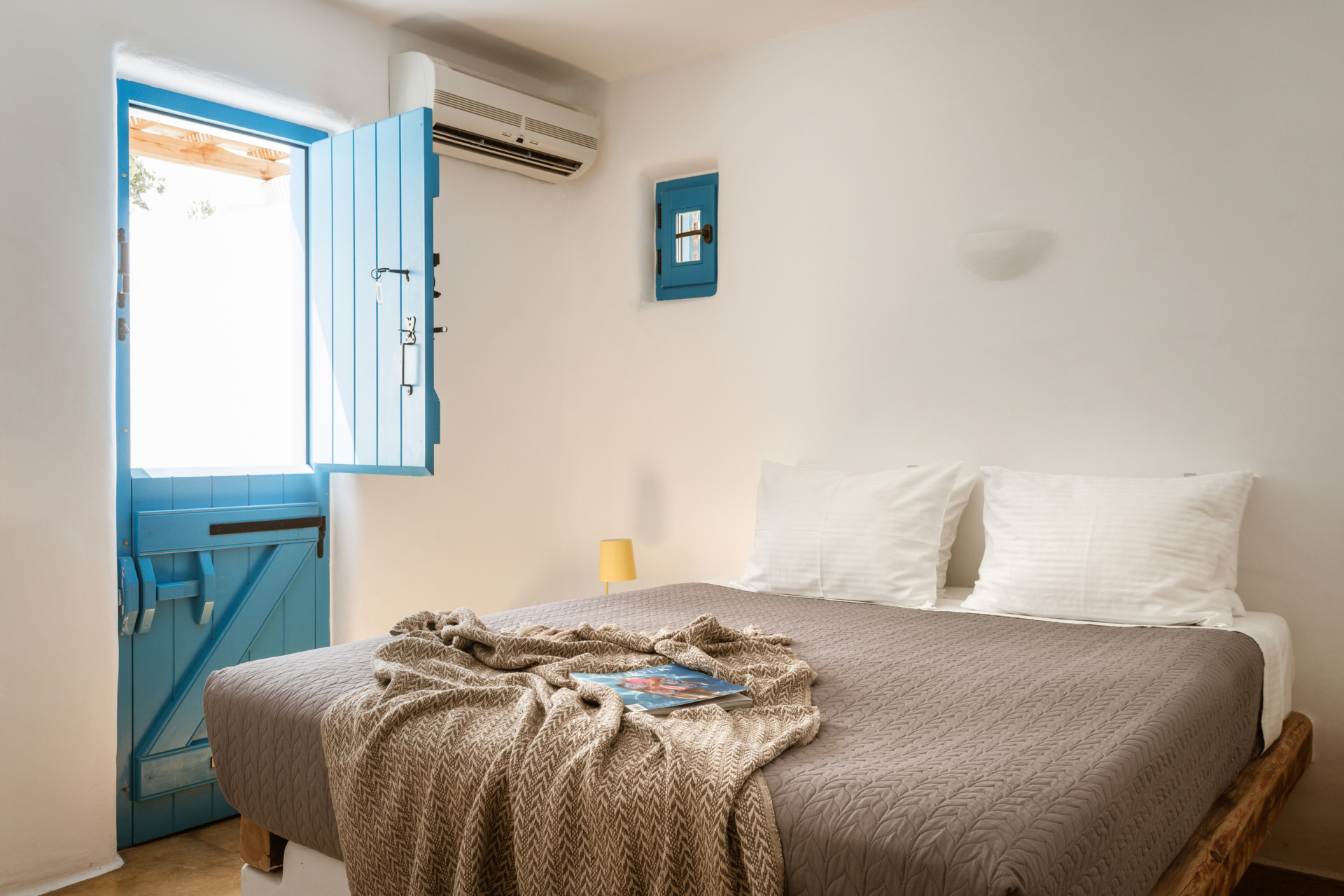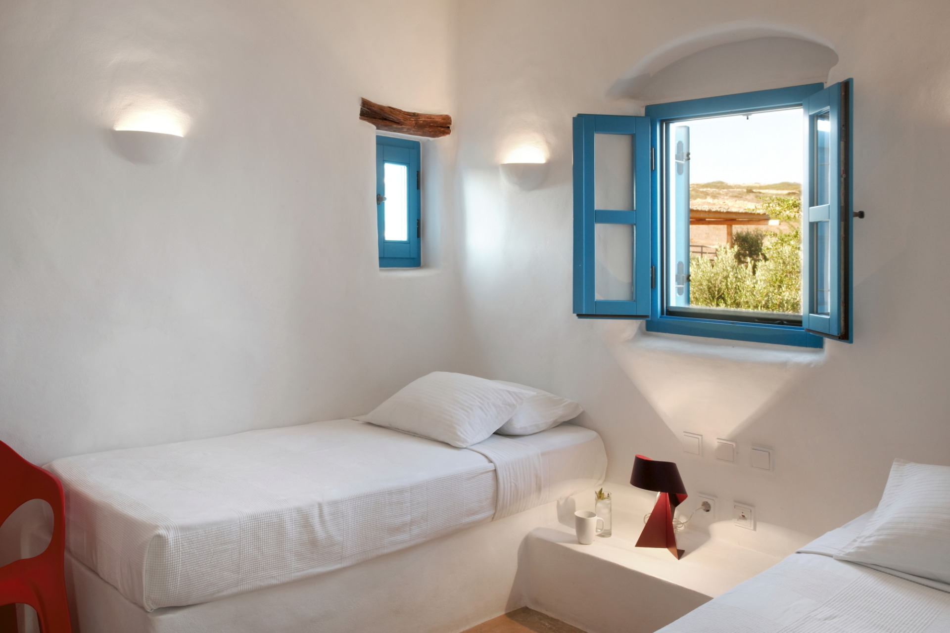 Ground Floor: living room area with view to the garden, a sofa bed- which can accommodate comfortably one extra guest- and a kitchenette. Living room has direct access to a covered terrace for outdoor dining & relaxing.